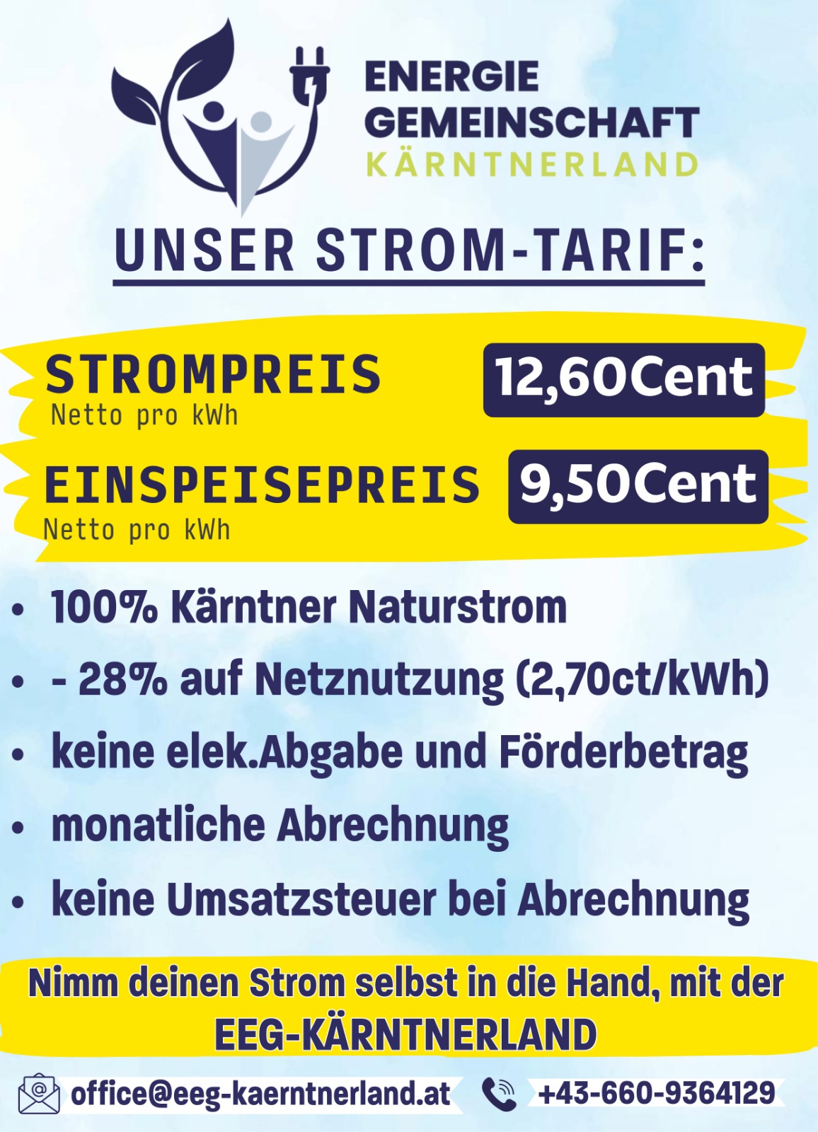 Gemeinsam für ein starkes Kärnten: Die EEG Kärntnerland nutzt den Ökostrom aus unserer Heimat Die Energiegemeinschaft Kärntnerland (EEG Kärntnerland) steht für mehr als nur Strom. Wir sind ein unabhängiger Verein – von Menschen aus Kärnten, für ganz Kärnten. Unser Vereinszweck: 100 % Ökostrom aus der Region, fair verteilt und gemeinsam…